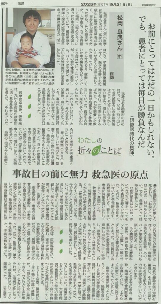 記事では、松岡理事長が救急医を志した原点や、松岡救急クリニック開院までの歩みが紹介されています。